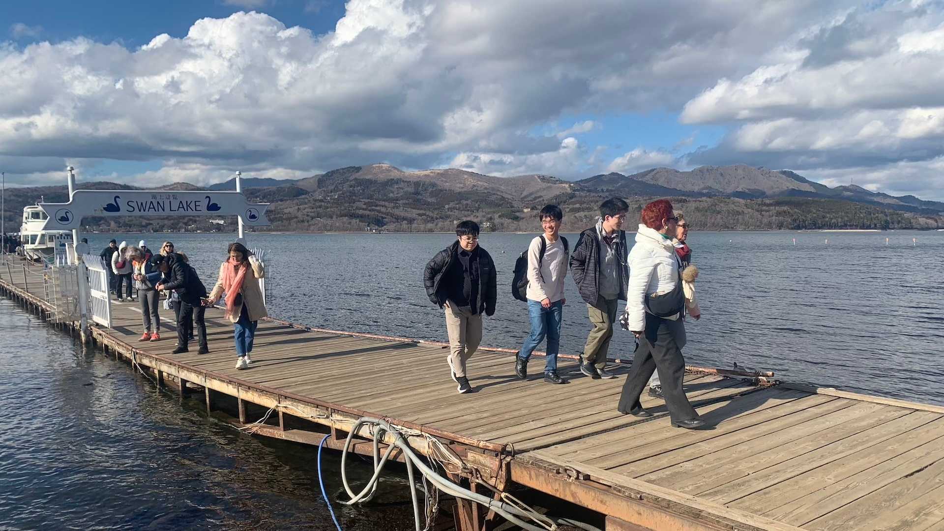 遊覧船の中から山中湖を眺める様子 桟橋を渡る様子